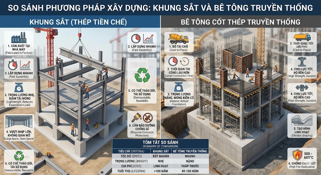 Hình 3: So sánh khung sắt và bê tông truyền thống