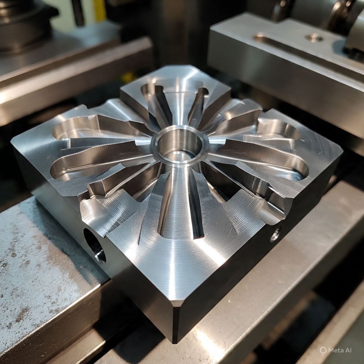 Chi tiết được gia công trực tiếp trên máy phay CNC đa trục hiện đại.