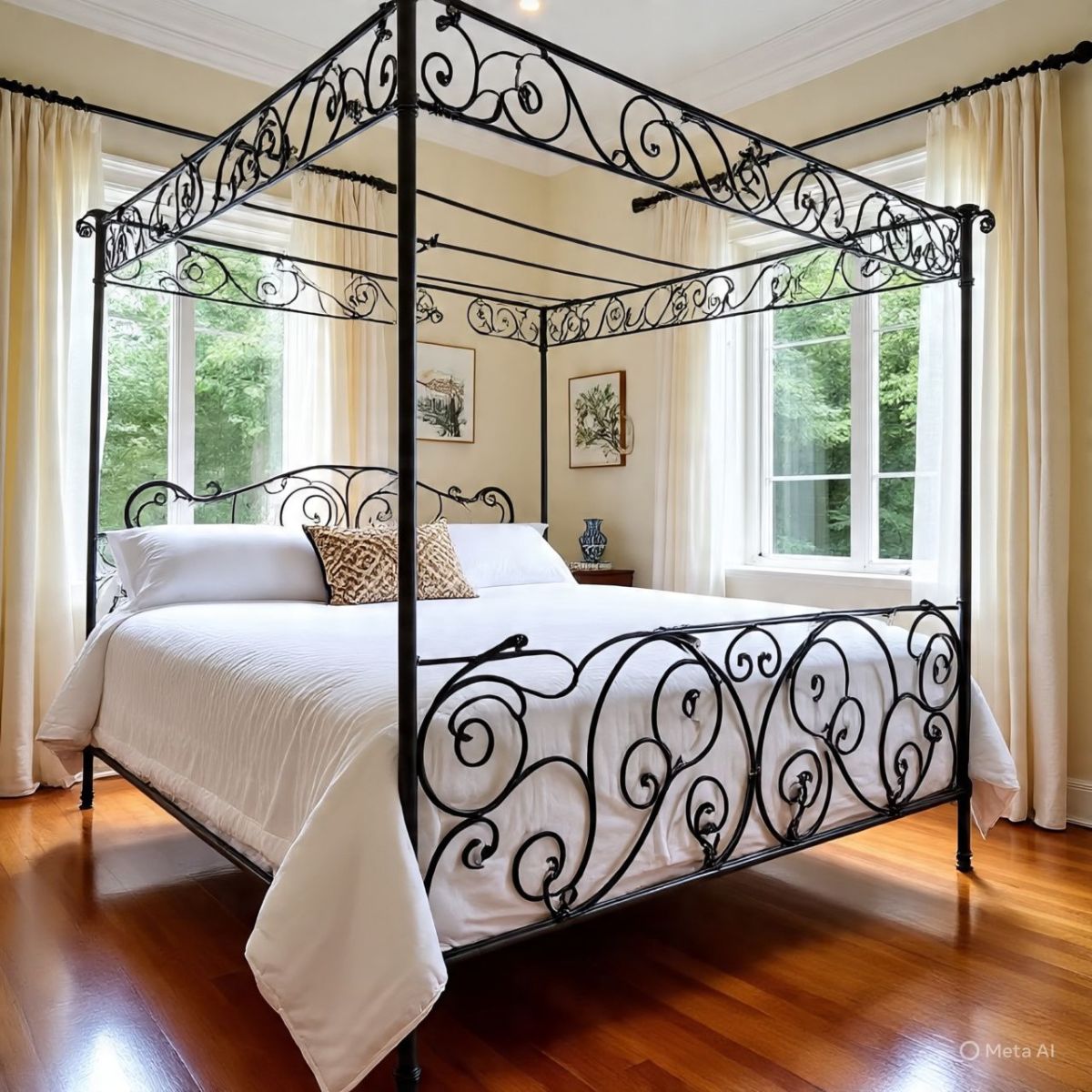 📷 Hình 5: Giường sắt mỹ thuật hoa văn uốn cong tinh tế trong biệt thự cao cấp