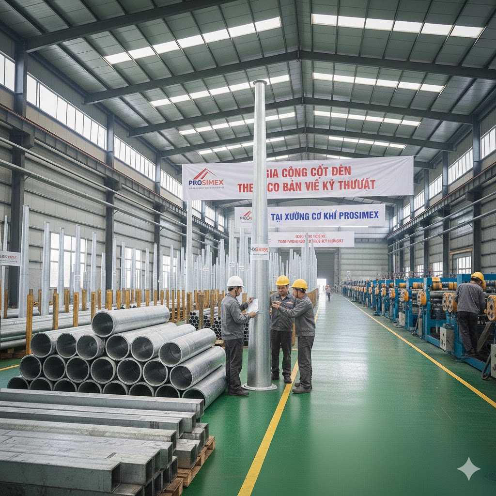 Với năng lực sản xuất mạnh, hệ thống máy móc hiện đại và đội ngũ kỹ sư nhiều kinh nghiệm, Cơ Khí Prosimex là đơn vị chuyên nhận gia công cột đèn theo bản vẽ kỹ thuật chuẩn dự án, đáp ứng tốt các yêu cầu khắt khe của chủ đầu tư và nhà thầu trên toàn quốc.