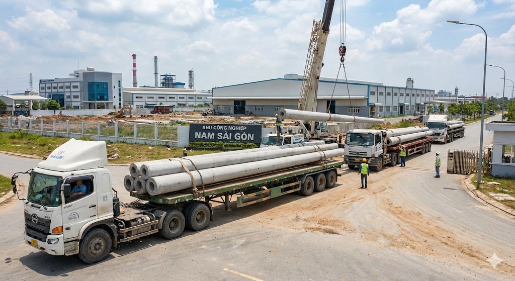 Hình 4: Vận chuyển cột điện bê tông cho khu công nghiệp