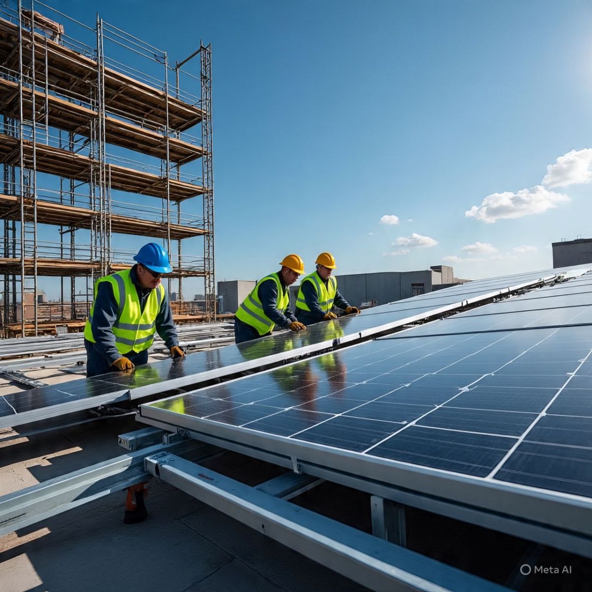 Hình minh họa 2: Kỹ sư Prosimex lắp ráp khung pin mặt trời quy mô lớn 🏗️