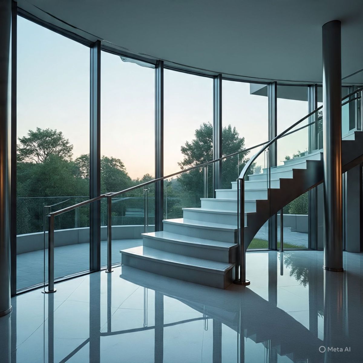 - Biệt thự cao cấp: Cầu thang xoắn thép nghệ thuật, lan can kính kết hợp inox.