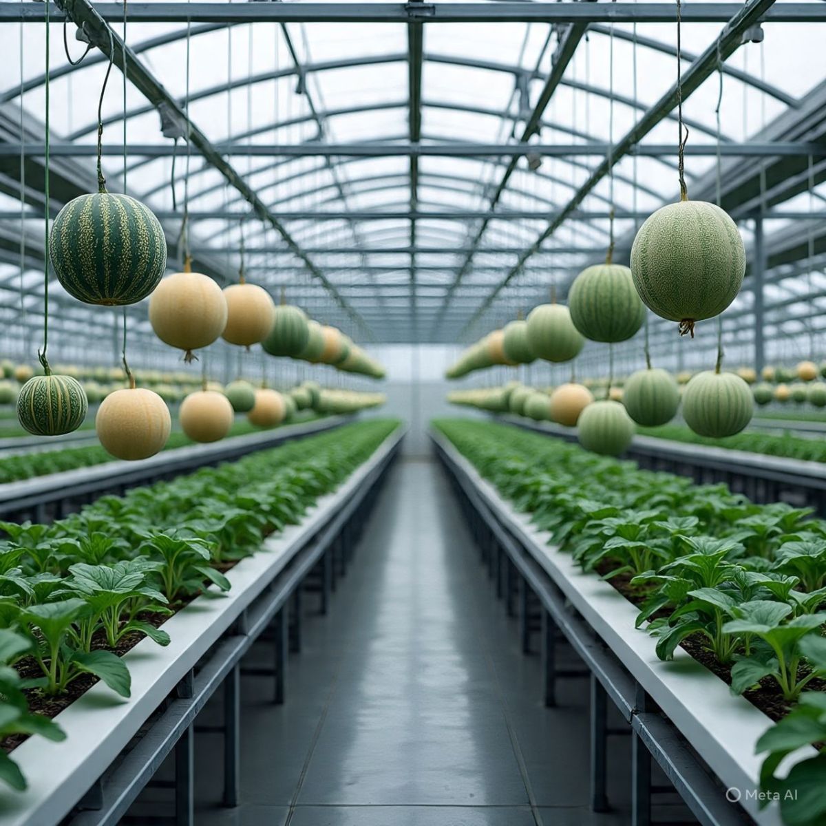 Hình 3: Hệ thống giàn thép treo cây dưa lưới trong nhà kính công nghệ cao.