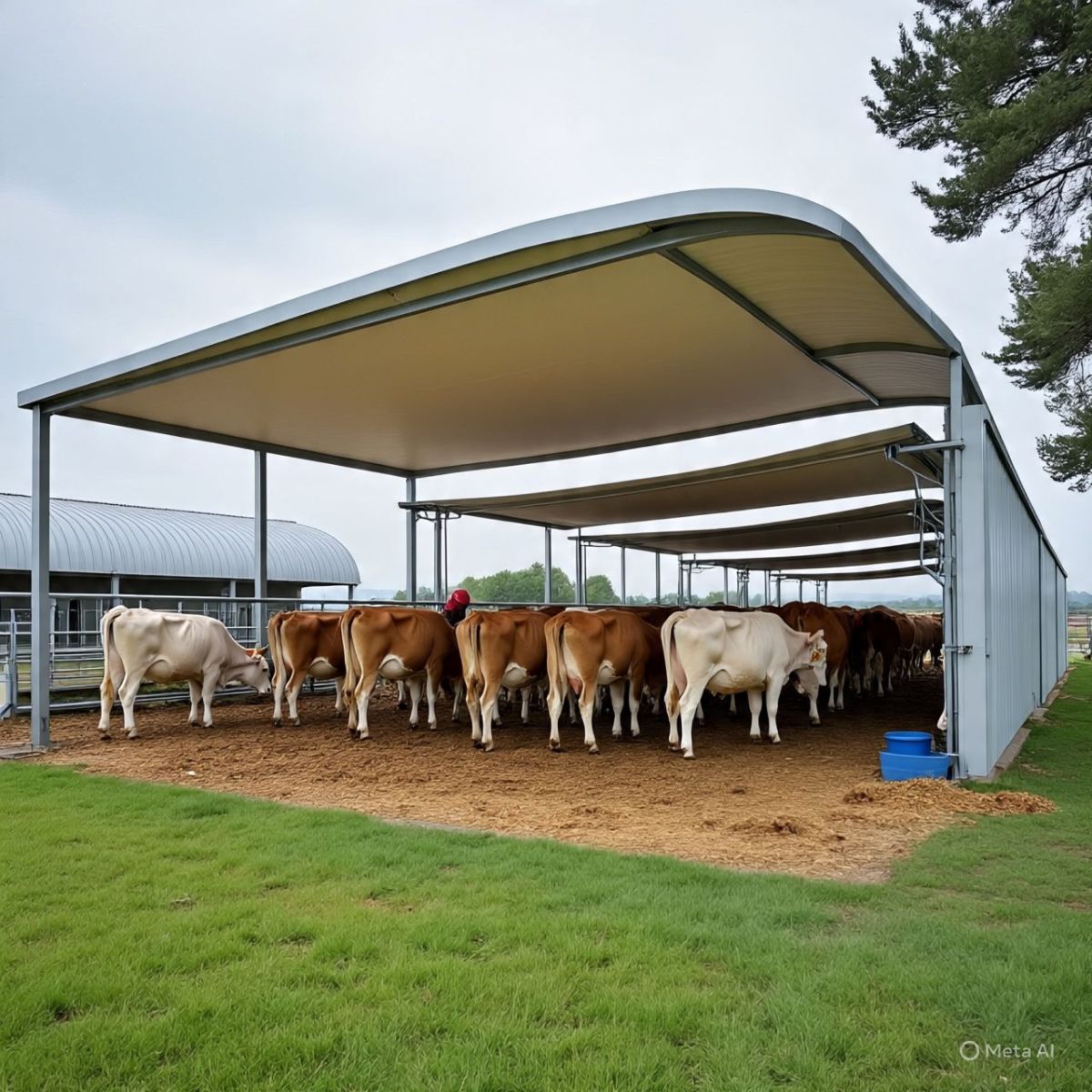 - Chuồng bò sữa: Che mưa nắng, tạo môi trường mát mẻ, hạn chế stress cho bò.