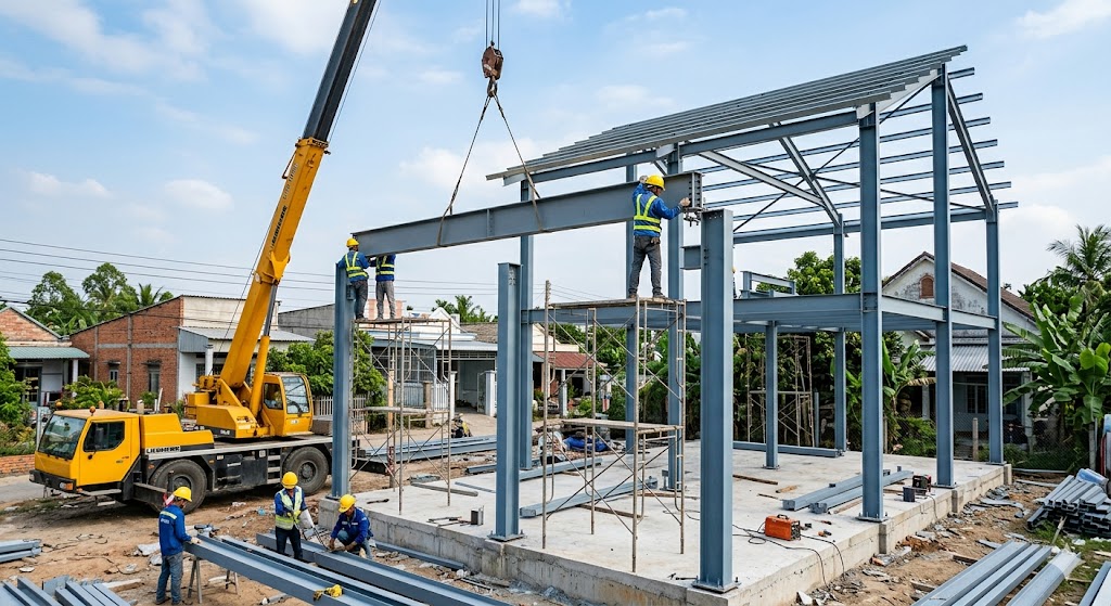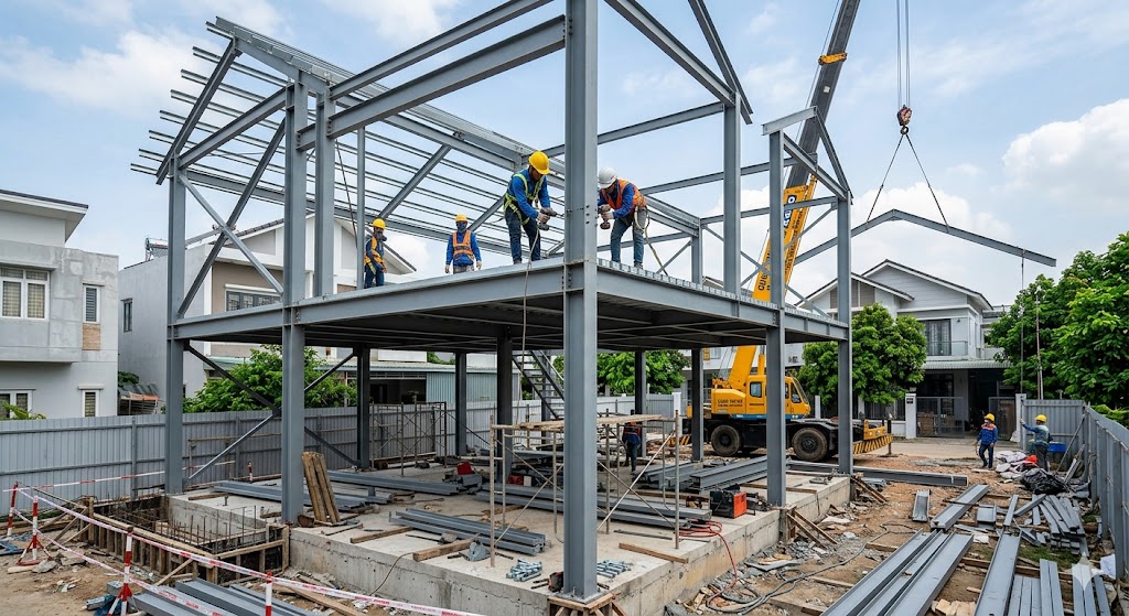 Trong những năm gần đây, xu hướng xây dựng nhà dân dụng bằng khung thép tiền chế ngày càng phổ biến tại Việt Nam. Không chỉ áp dụng cho nhà xưởng, kết cấu thép còn được ứng dụng rộng rãi trong nhà ở, nhà trọ và homestay nhờ vào ưu điểm thi công nhanh, chi phí hợp lý và thiết kế linh hoạt.