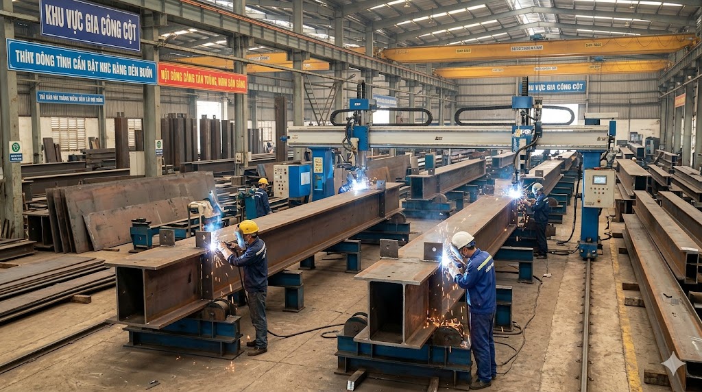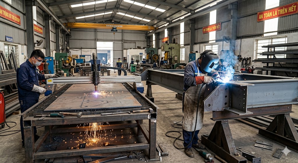 3. Gia công khung nhà thép tiền chế gồm những hạng mục nào? Quy trình chi tiết từ A–Z – Cơ Khí Prosimex