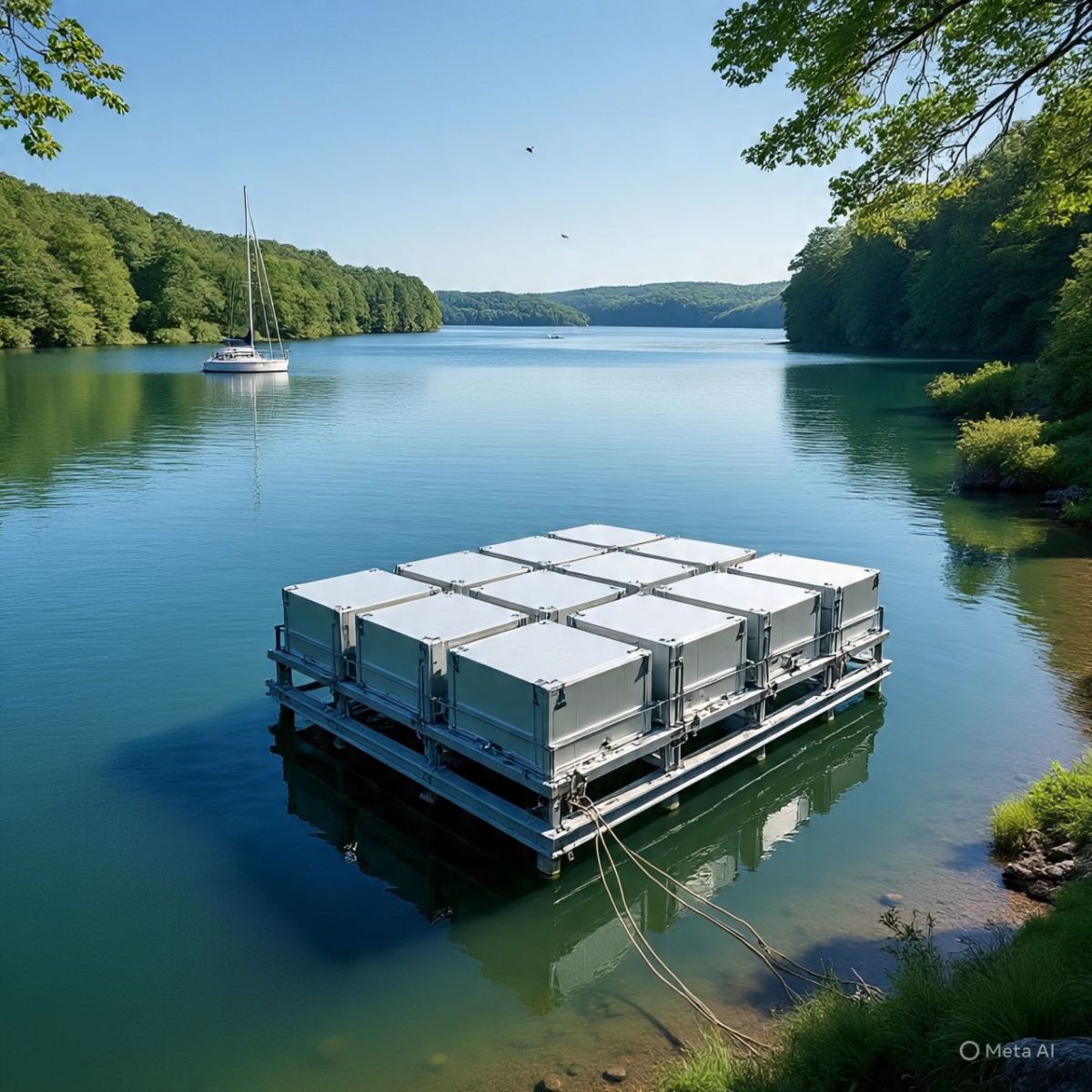 📸 Hình 2: Hệ thống pin nổi di động với khung nhôm nhẹ được lắp đặt trên hồ thủy điện