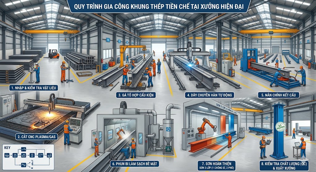 Hình 1: Quy trình gia công khung thép tiền chế tại xưởng hiện đại