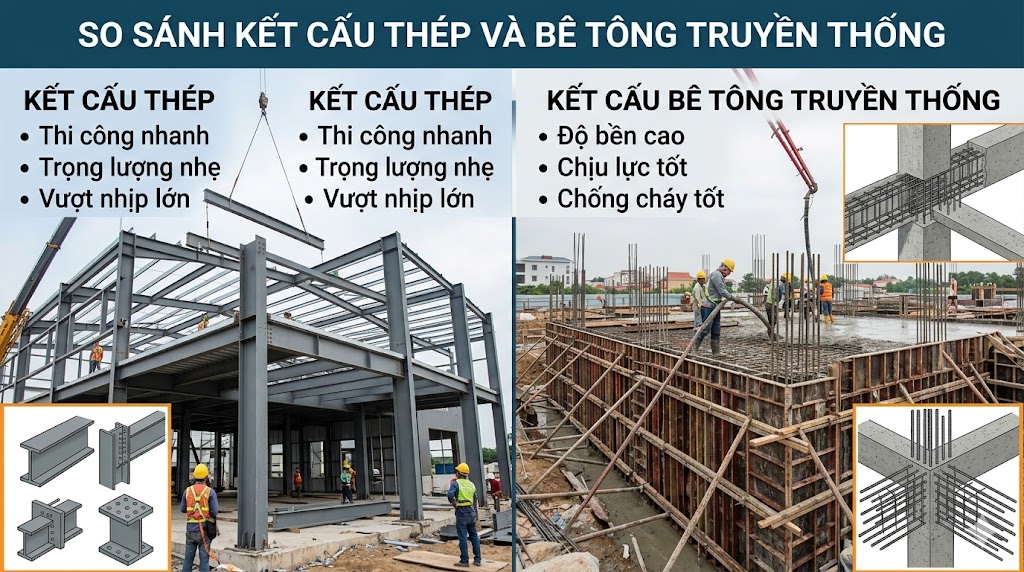 Hình 3: So sánh kết cấu thép và bê tông truyền thống