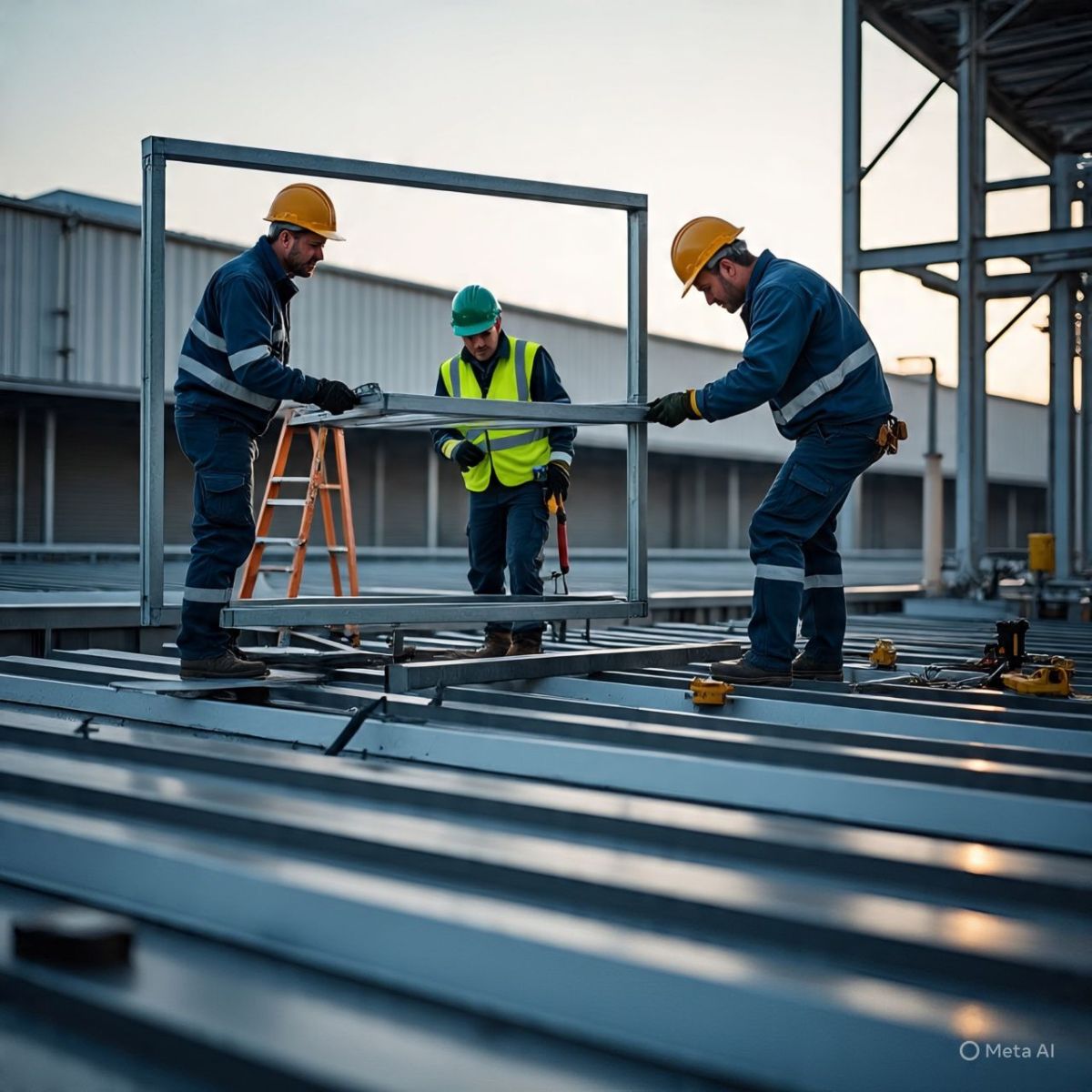 Hình 2: Kỹ sư Prosimex lắp đặt khung và giá đỡ pin trên mái tôn 🏭