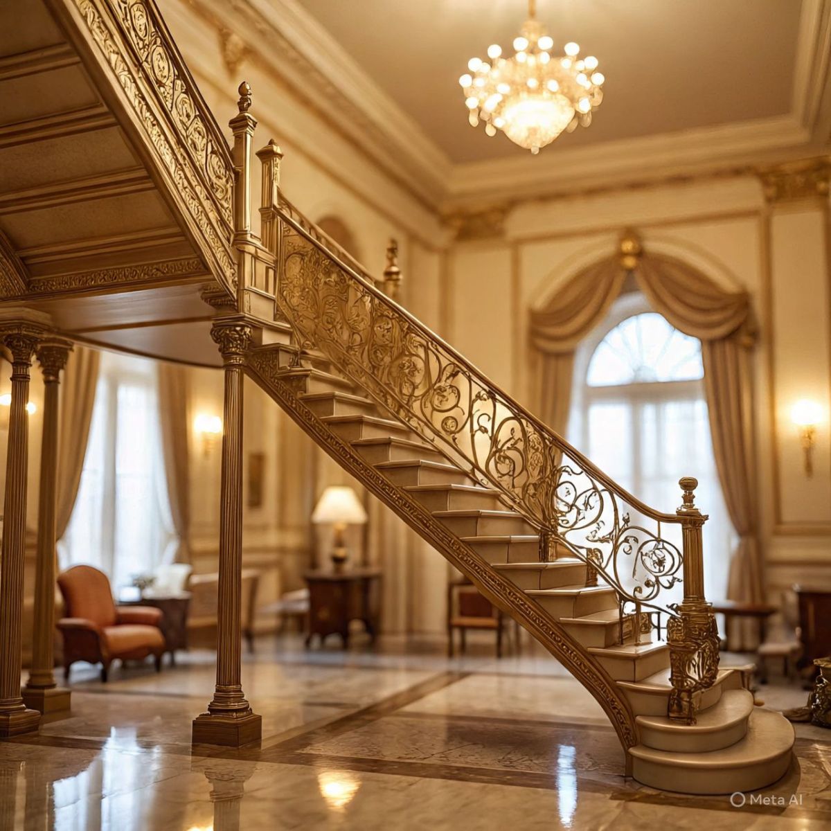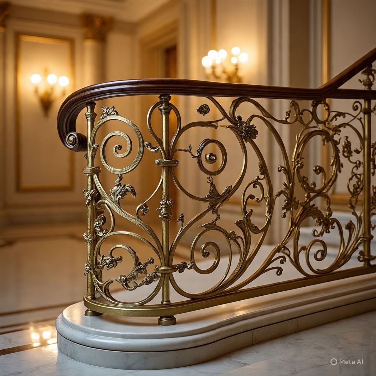 📷 Hình 1: Lan can cầu thang mỹ thuật bằng sắt uốn hoa văn tinh xảo, mạ vàng sang trọng