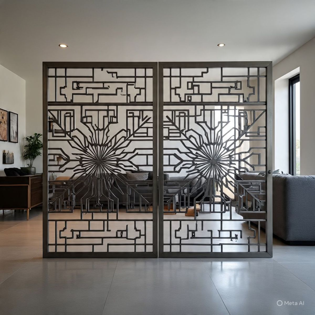 📷 Hình 3: Vách ngăn CNC kim loại mỹ thuật với hoa văn hiện đại trong nhà phố