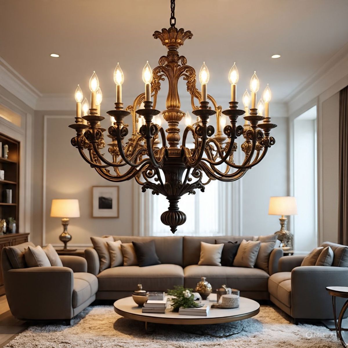 📷 Hình 5: Đèn chùm mỹ thuật bằng đồng uốn nghệ thuật, tạo điểm nhấn sang trọng cho phòng khách