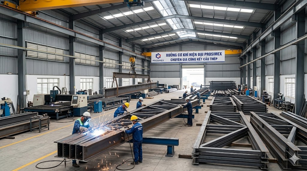 Hình 1: Gia công cấu kiện khung thép tại xưởng hiện đại Prosimex