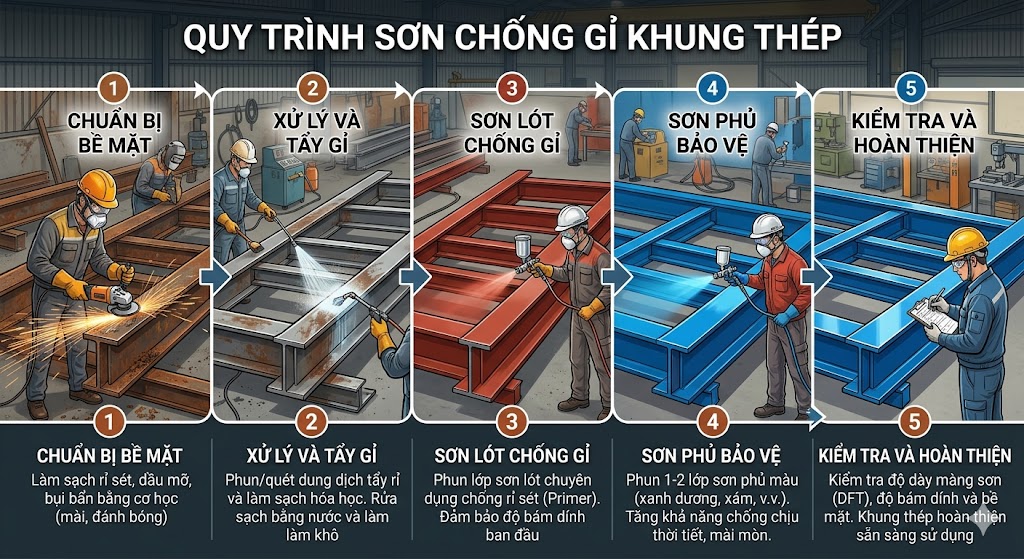 Hình 2: Quy trình sơn chống gỉ khung thép