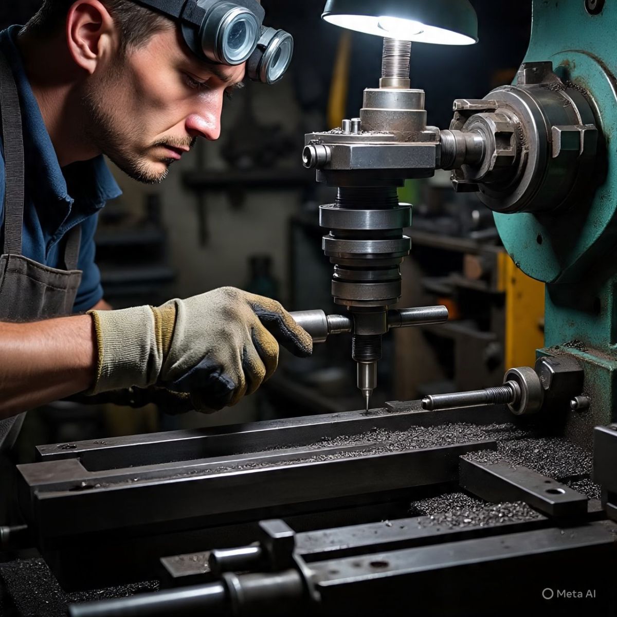 📷 Hình 5: Thợ cơ khí gia công thủ công chi tiết kim loại bằng máy tiện cơ.