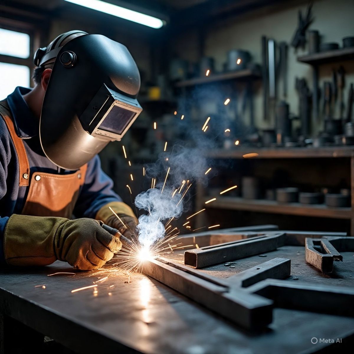 📷 Hình 1: Thợ cơ khí thủ công đang hàn và gia công nội thất kim loại.