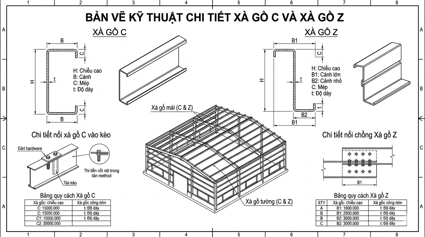 Xà gồ C, Z là một trong những cấu kiện quan trọng không thể thiếu trong kết cấu thép hiện đại, đặc biệt là trong các công trình nhà thép tiền chế, nhà xưởng công nghiệp, nhà kho và các công trình dân dụng quy mô lớn. Việc gia công xà gồ không đơn giản chỉ là tạo hình thép theo dạng chữ C hoặc chữ Z mà còn là một quá trình đòi hỏi sự chính xác cao, tuân thủ nghiêm ngặt các tiêu chuẩn kỹ thuật nhằm đảm bảo độ bền, khả năng chịu lực và tuổi thọ công trình.