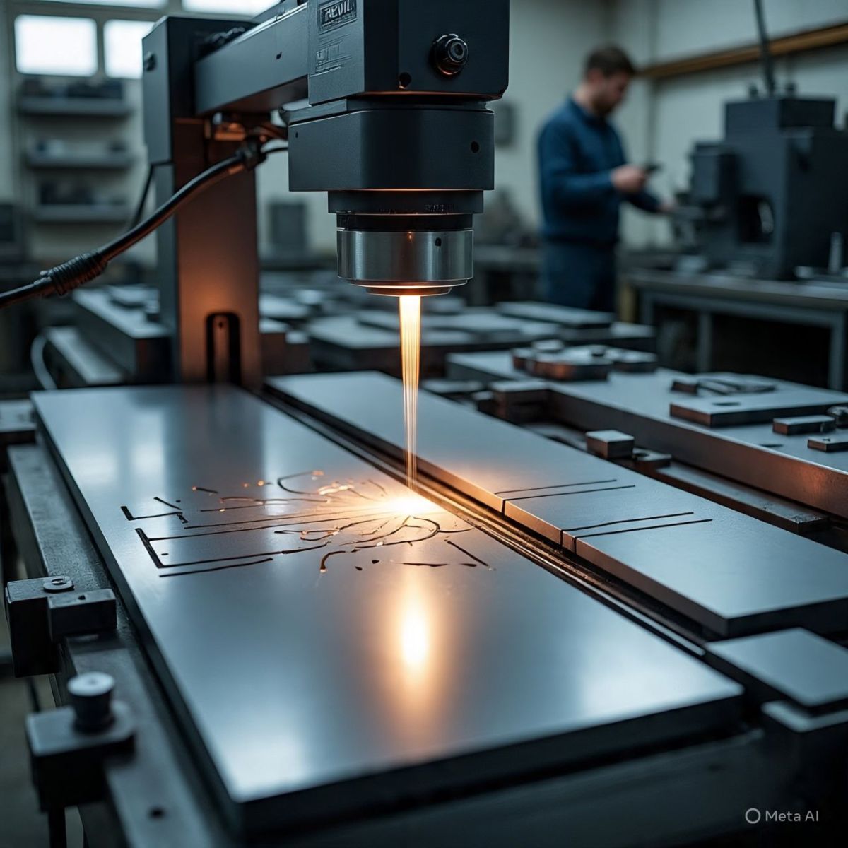 - Cắt kim loại: Sử dụng máy cắt laser, plasma hoặc cắt cơ học để tạo hình ban đầu cho tấm kim loại. ✂️