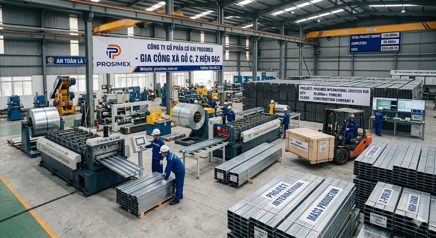 Cơ Khí Prosimex là đơn vị chuyên gia công xà gồ C, Z chất lượng cao, đáp ứng mọi yêu cầu kỹ thuật cho các công trình thực tế.