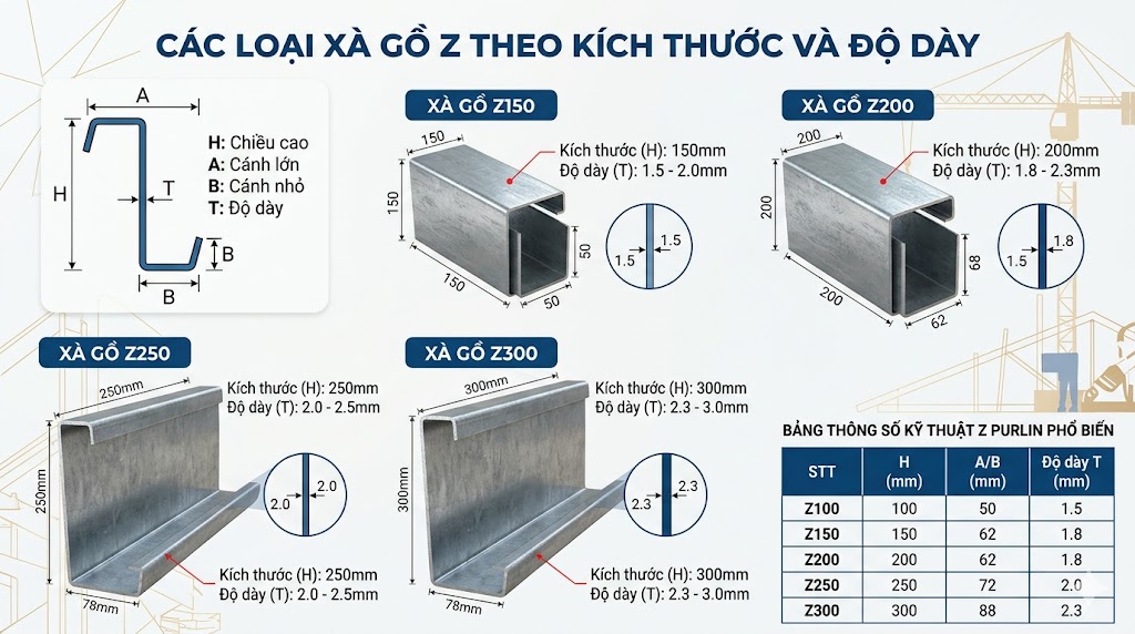 Hình 3: Các loại xà gồ Z theo kích thước và độ dày
